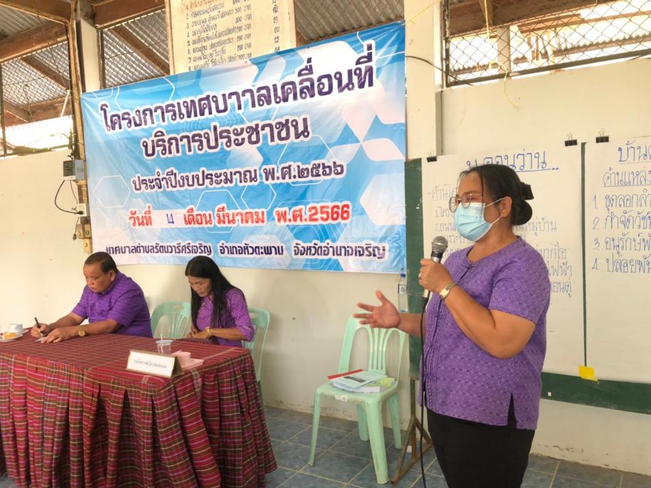 description เทศบาลตำบลรัตนวารีศรีเจริญได้ดำเนินโครงการเทศบาลเคลื่อนที่ เพื่อบริการประชาชนในด้านต่างๆ เช่น งานจัดทำแผนพัฒนาท้องถิ่น งานสังคมสงเคราะห์ งานกองคลัง งานภาษี งานสธารณสุข งานป้องกันและบรรเทาสาธารณะภัย งานการศึกษา งานการให้คำปรึกษาด้านกฎหมาย ทั้งนี้ได้มีการจัดเวทีประชาคม เพื่อรับฟังความต้องการของพี่น้องประชาชน เพื่อการจัดทำแผนพัฒนาท้องถิ่น ในระหว่างวันที่ 14 - 22 มีนาคม 2566 จำนวน 7 หมู่บ้าน ดังนี้ บ้านดินว่าน ม.9 ต.หัวตะพาน วันที่ 14 มีนาคม 2566 / บ้านท่าวังหิน ม.3 ต.หัวตะพาน วันที่ 15 มีนาคม 2566 /บ้านโสกสว่าง ม.5 ต.หัวตะพาน วันที่ 16 มีนาคม 2566 / บ้านหนองแสง ม.7 ต.รัตนวารี วันที่ 17 มีนาคม 2566 / บ้านหนองเดิ่น ม.5 ต.รัตนวารี วันที่ 20 มีนาคม 2566 / บ้านโต่งโต้น ม.4 ต.รัตนวารี วันที่ 21 มีนาคม 2566 / บ้านคำแหลม ม.4 ต.หัวตะพาน วันที่ 22 มีนาคม 2566 person admin