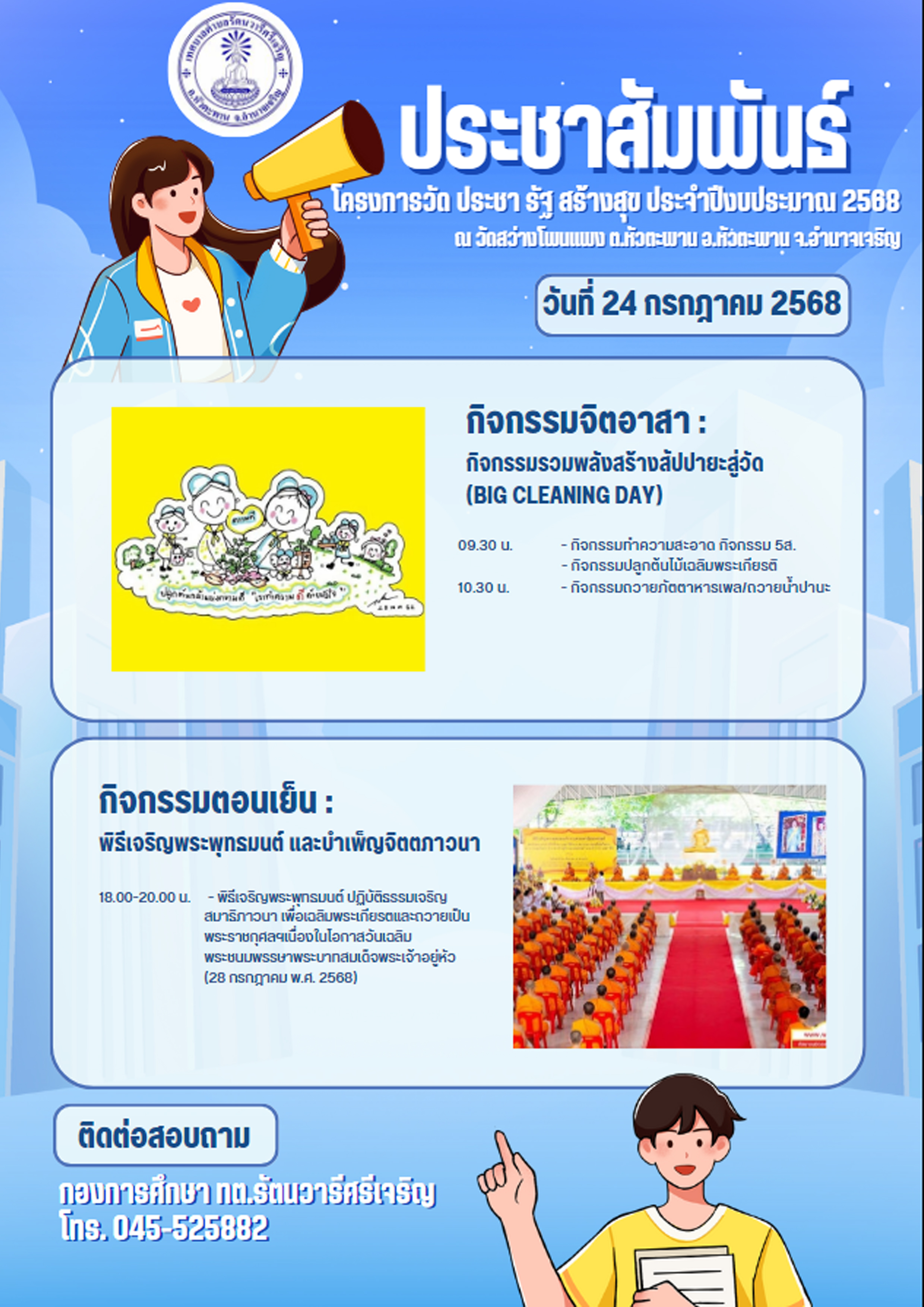 ครั้งที่ 2/2568 ในวันพฤหัสบดีที่ 24 เดือนกรกฎาคม พ.ศ. 2568 ณ วัดสว่างโพนแพง ชุมชนบ้านคำเจริญ ตำบลหัวตะพาน อำเภอหัวตะพาน จังหวัดอำนาจเจริญ